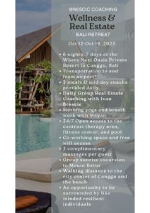 Join Ivan and the Brescic Coaching team for 5 unforgettable days of transformation β blending wellness, mindset, and real estate mastery in the stunning paradise of Bali.